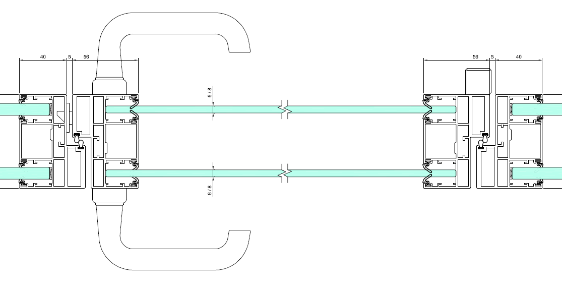 Aluminijasti profili dim. 80x54h mm, ki podpirajo 2 laminirani stekli, debeline največ 6 + 6 mm ali melaminske plošče debeline 18 mm.