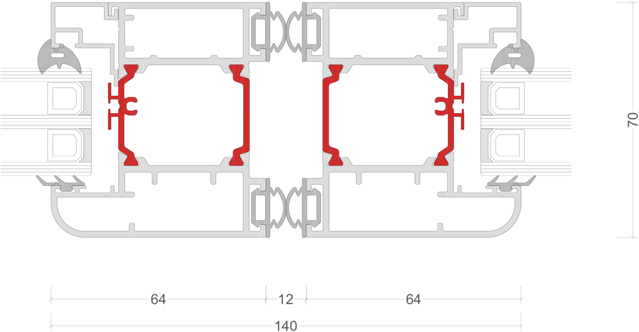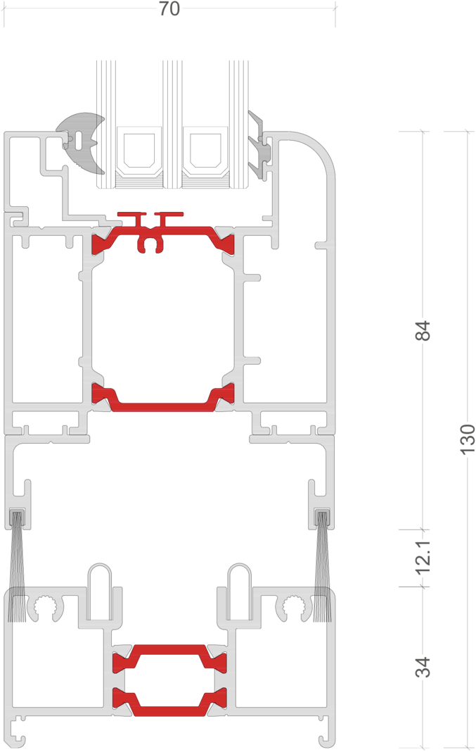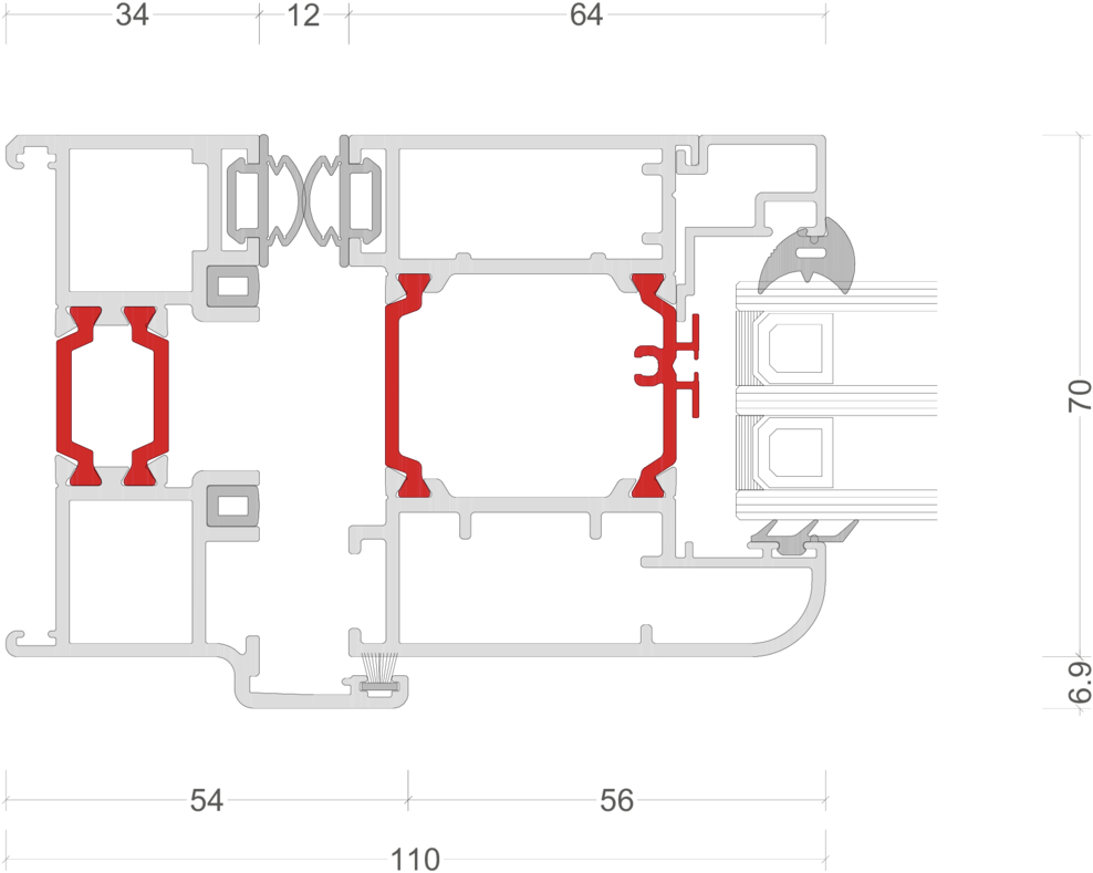 Drsno zgibni sistem. Ima prekinjen toplotni most in globino profilov 70mm. Z visokim pragom ali nizkim (15mm) poglobljenim pragom. Okovje je sistemsko.