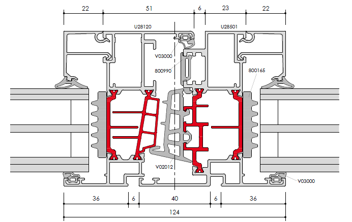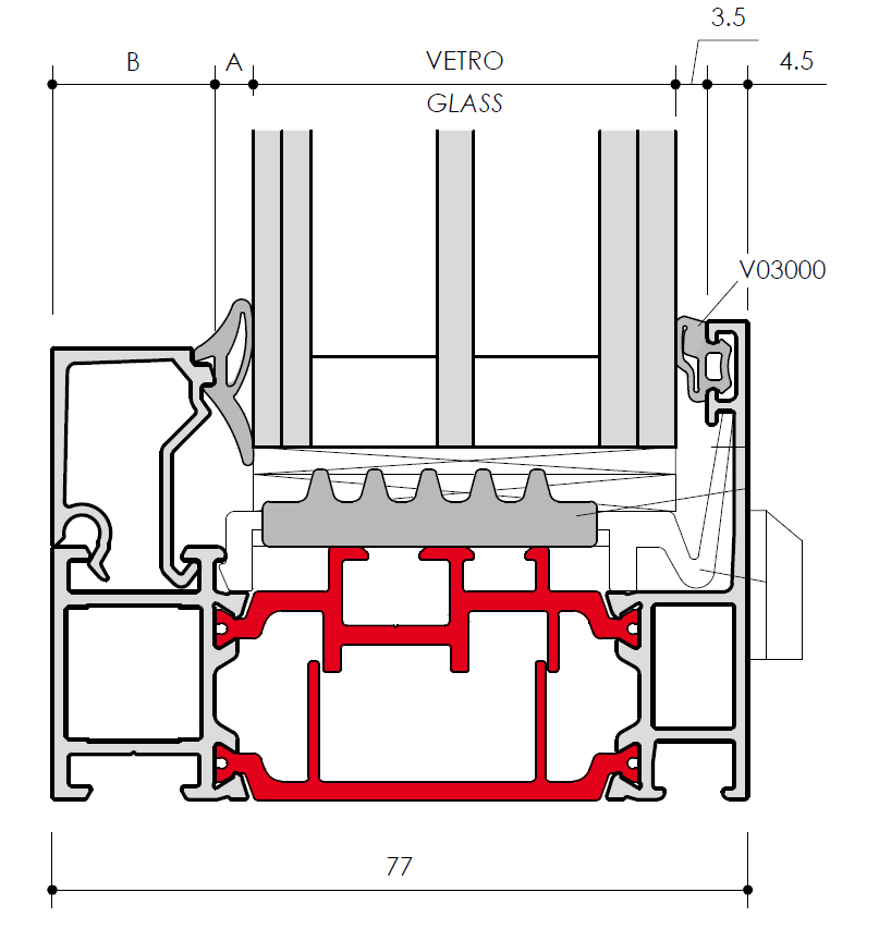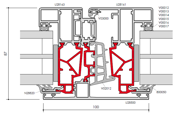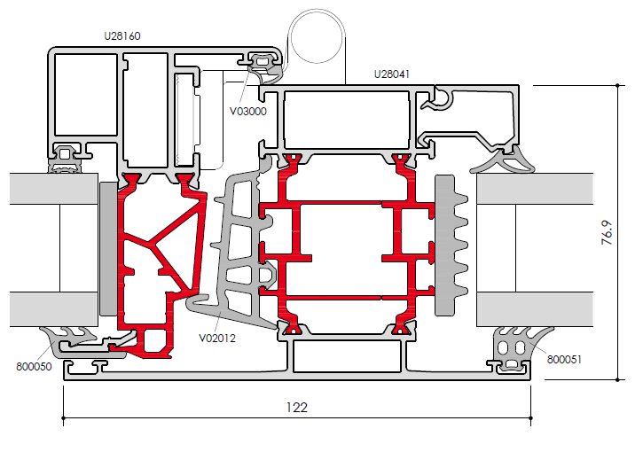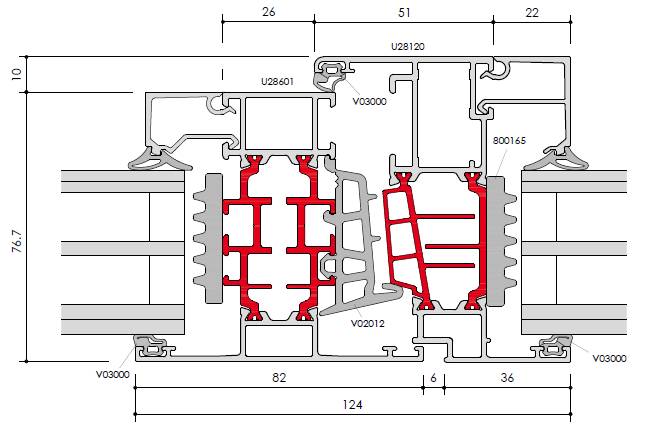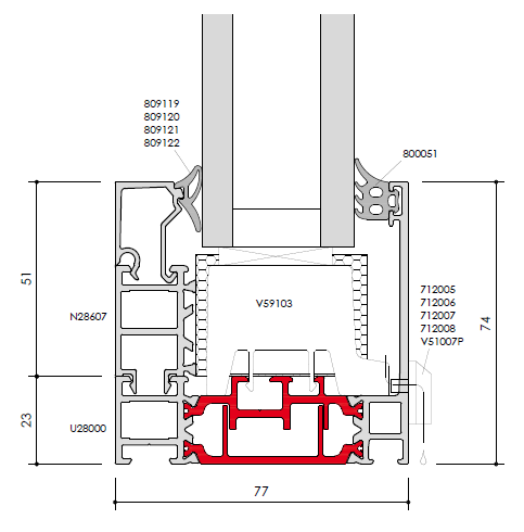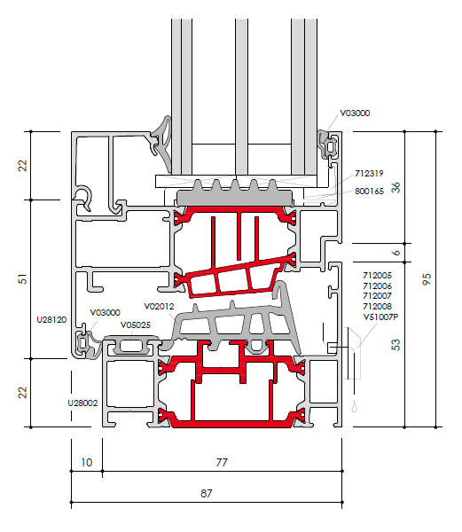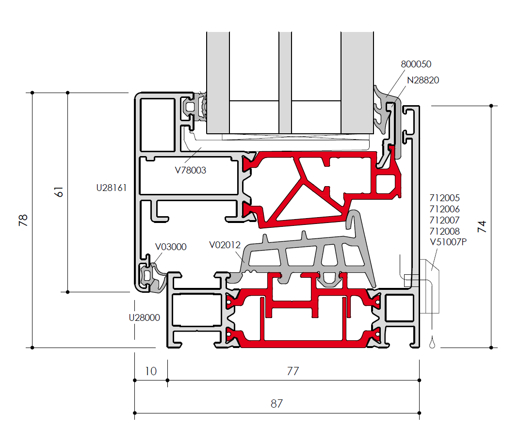 Globina osnovnih profilov je 77mm, globina kril je 87mm. Okovje je sistemsko.