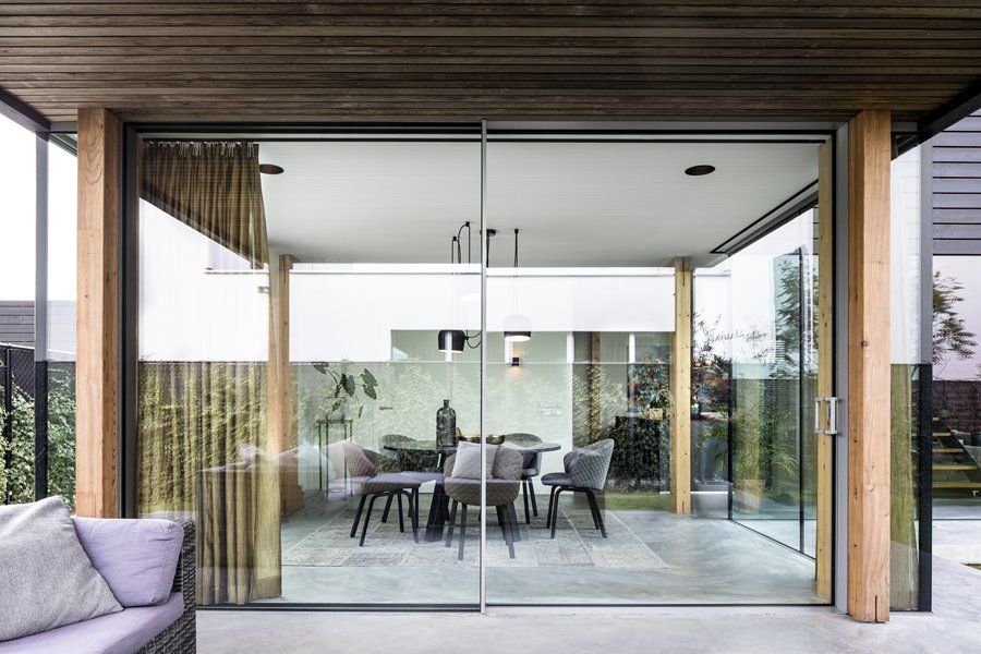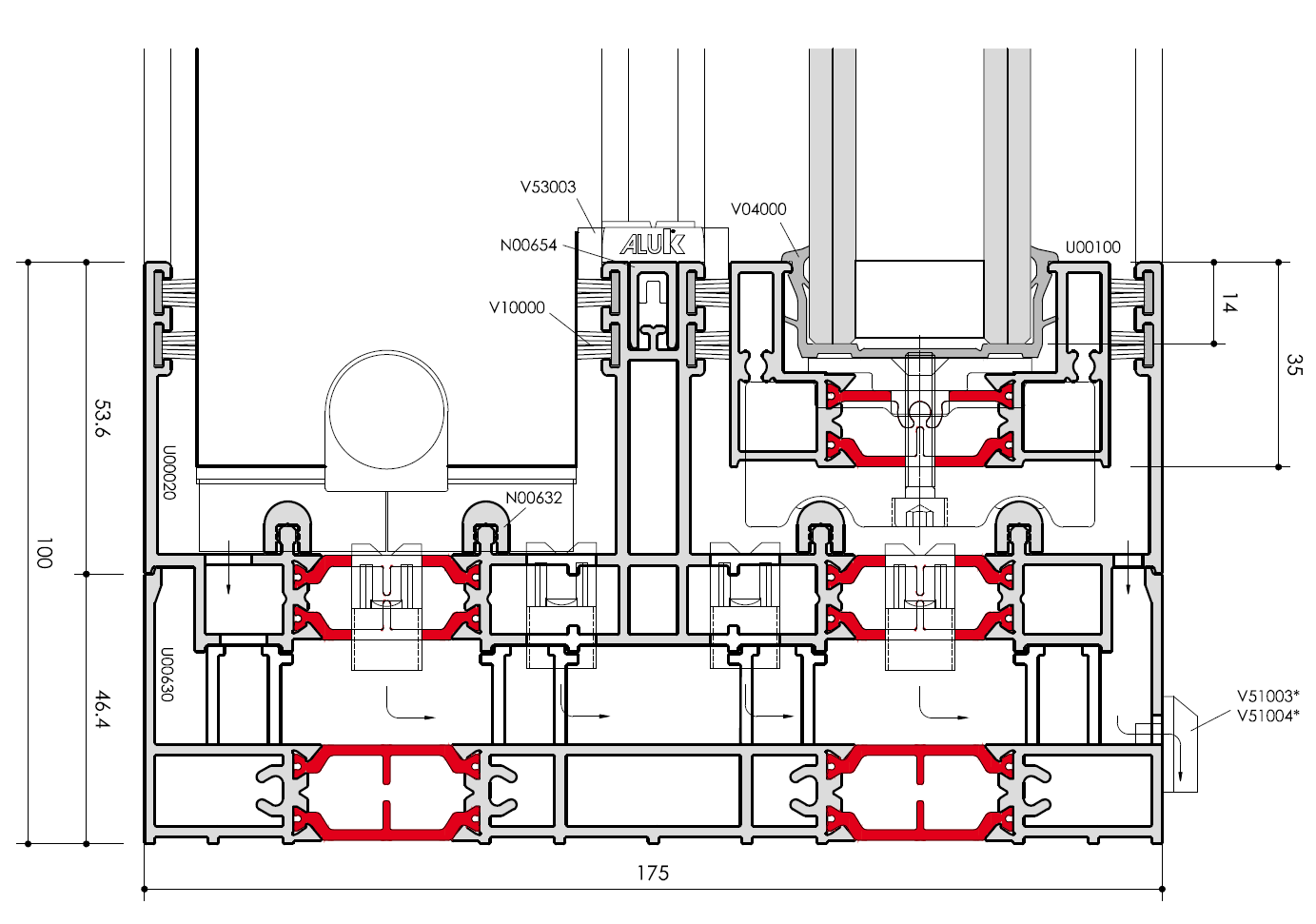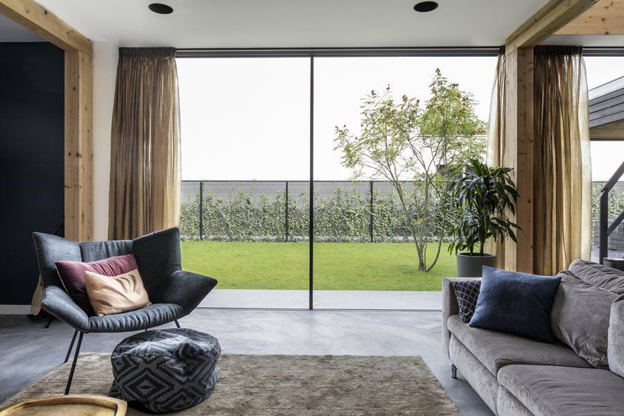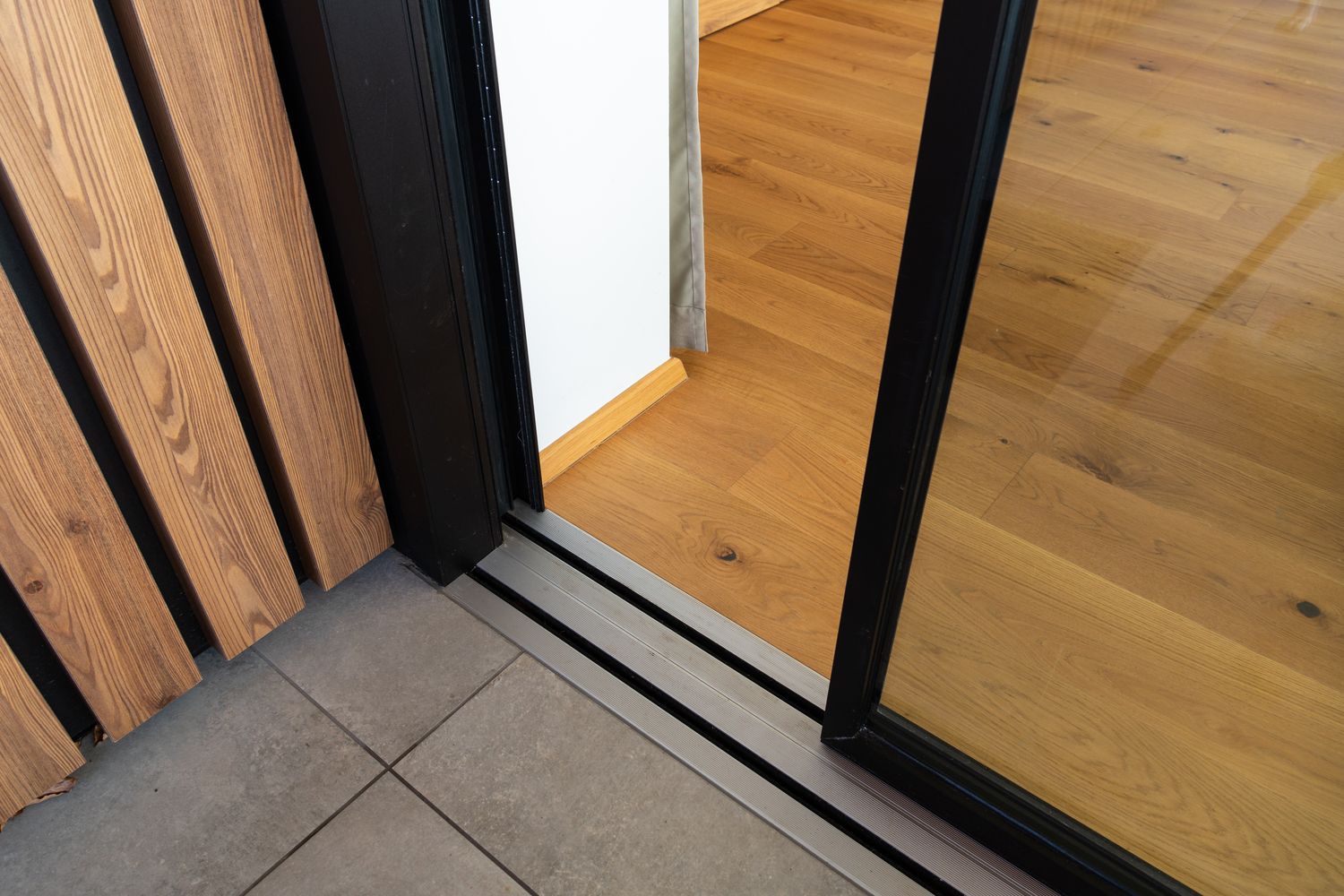 Aluminijasti okvir in krilo sta popolnoma skrita, pragovi pa so poravnani s tlemi, kar omogoča nemoten prehod med prostori.