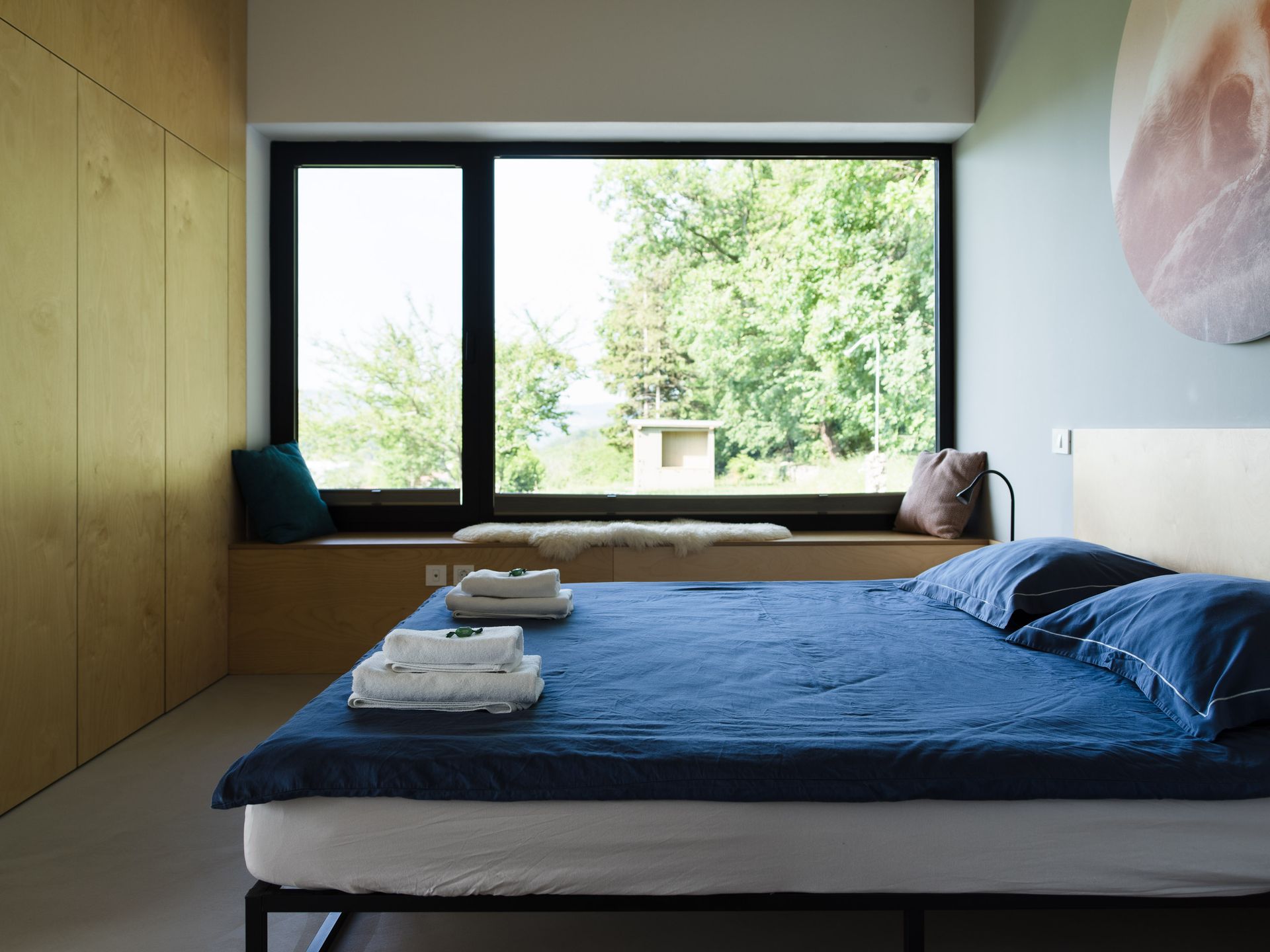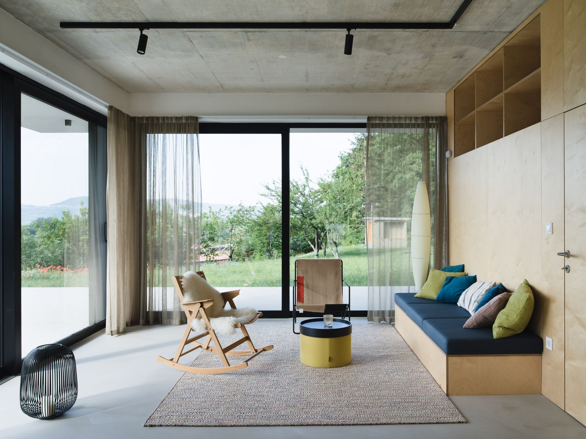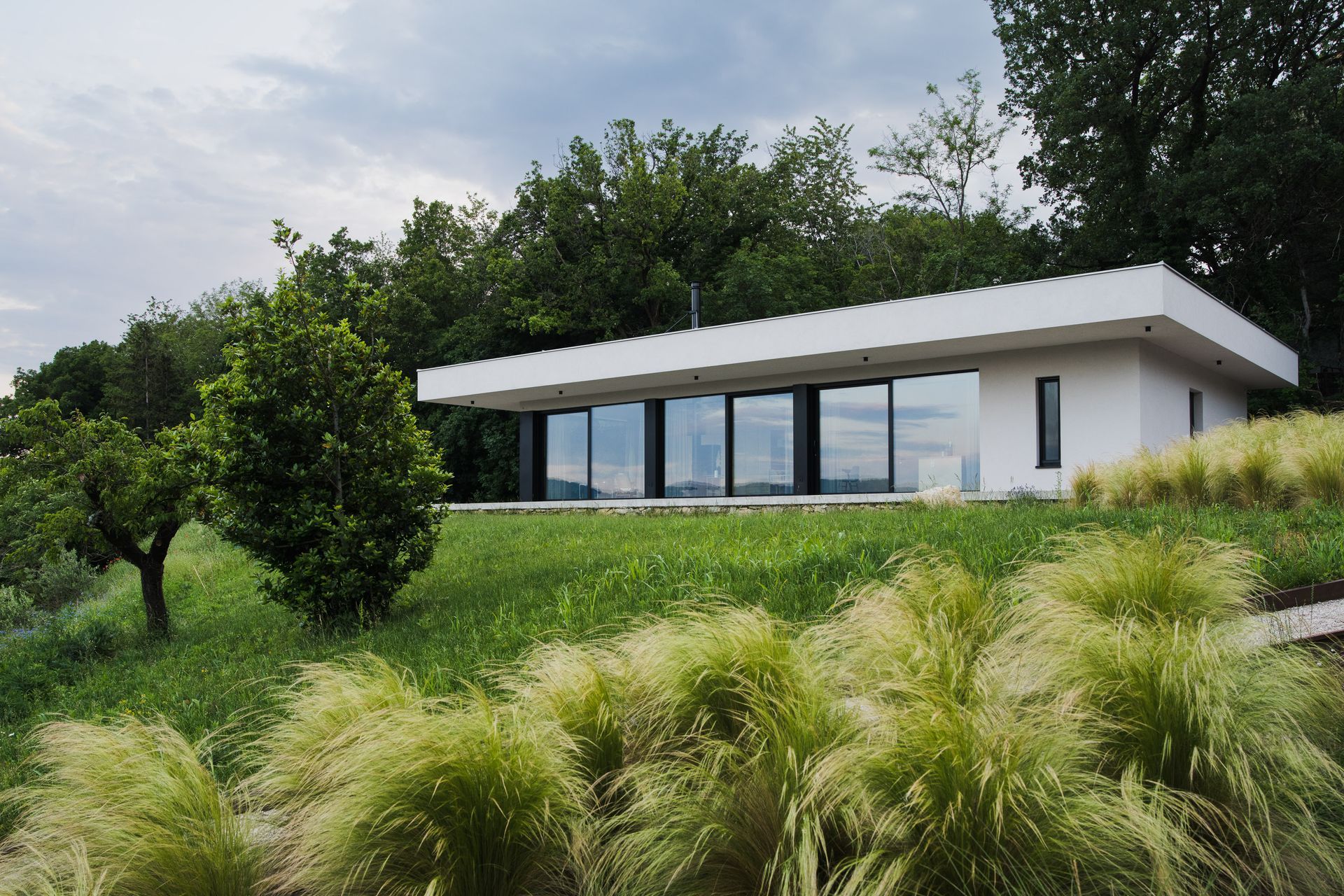 Enodružinska hiša nad Vipavsko dolino se s svojo minimalistično in umirjeno arhitekturo popolnoma zliva z naravnim okoljem. Enostavna pravokotna zasnova, ravna streha in veliki stekleni poudarki omogočajo odprt pogled na dolino in okoliško naravo ter ustvarjajo občutek prostorske zračnosti. Notranjost hiše nadaljuje idejo čistih linij, naravnih materialov in povezave z zunanjostjo. Vgrajeni sistemi AluK – drsni sistem SC156 in okenski sistem C77K – omogočajo visoko toplotno izolativnost ter brezhibno estetsko integracijo v arhitekturno zasnovo.