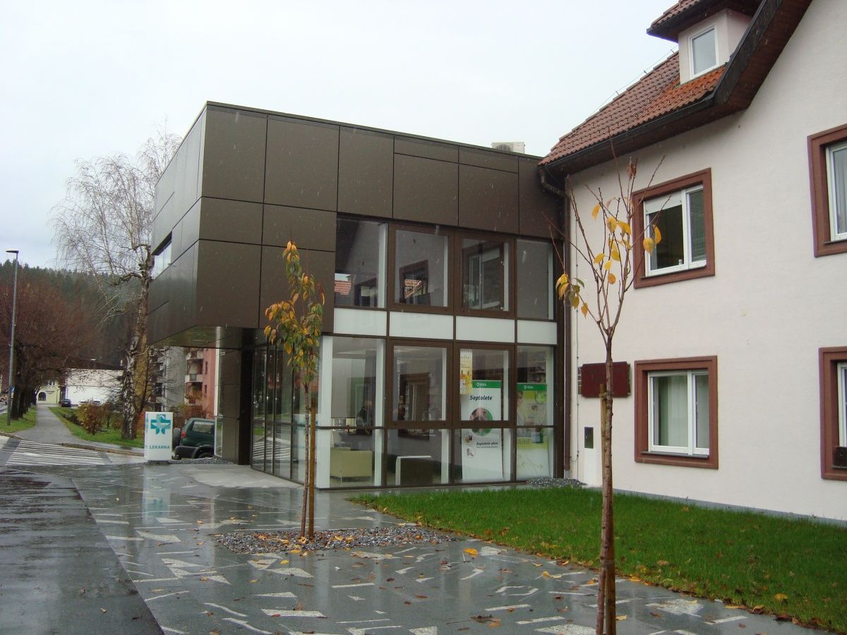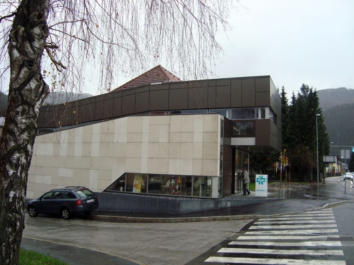 Moderna stavba lekarne v Mežici izstopa z izrazito arhitekturno podobo, ki jo zaznamuje kombinacija temnih fasadnih panelov in svetlih kamnitih oblog. Objekt s svojo obliko sledi funkcionalnosti, hkrati pa s sodobnim dizajnom vizualno dopolnjuje mestno središče. Velike steklene površine zagotavljajo naravno osvetlitev notranjosti, medtem ko čist volumen in kontrastni materiali ustvarjajo samozavesten, a umirjen vizualni vtis. Arhitektura objekta lepo združuje sodobnost z uporabnostjo v lokalnem okolju.